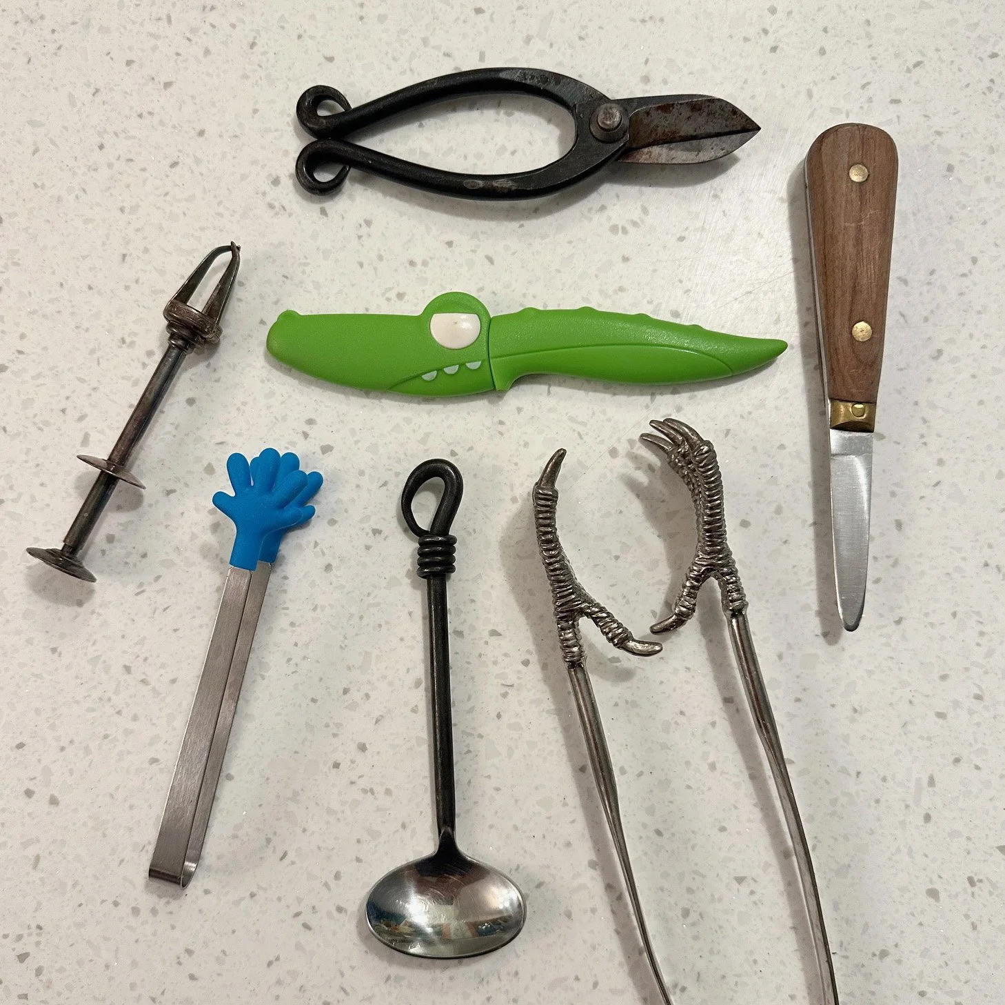 Fiddlehead Foundry is the result of years of experiments and creative investigations, along with a life-long fascination with food and functional objects. A couple years ago, helping with a friend’s dinner party, I brought along several serving utensils for a charcuterie board. These were odd pieces collected over the years, like an antique spring-loaded pickle-plucker, and a set of tongs shaped like bird claws. I noticed that the guests enjoyed playing with, and talking about, the utensils as much as the food. That was surprising, since the food was made by my talented friend, Chef Mike, for a group of foodies and fine-dining restaurant workers. It struck me that eating utensils could be a bigger part of a dinner party. Few products are held so close yet regarded so little.